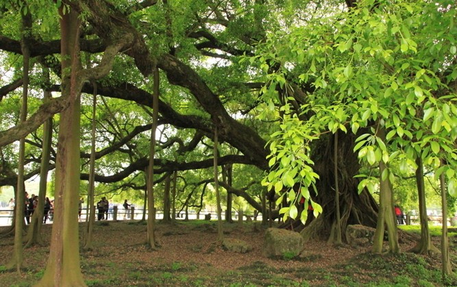陽朔大榕樹矗立在金寶河畔,它的樹圍竟有七米多,高達(dá)十七米,枝繁葉茂,濃蔭蔽日,所蓋之地有一百多平方米。相傳已有千年歷史,雖然樹干老態(tài)龍鐘,盤根錯節(jié),但仍然生機勃勃。在電影里,劉三姐就是在這棵樹下向阿牛哥吐露心聲,拋出傳情繡球的。版權(quán)所有山東聊城聊之旅國際旅行社有限公司,轉(zhuǎn)載必究!大榕樹公園位于陽朔城南7.5公里的高田鎮(zhèn)穿巖村的金寶河南岸。大榕樹樹高17米,圍7.05米,覆蓋面積100多平方米。樹冠呈圓形,遠(yuǎn)望似一把綠傘,近看盤根錯節(jié),葉茂蔽天。相傳此樹植于晉代,距今已有1500多年。進入了古榕公園以后,當(dāng)您在冠如華蓋的巨大樹蔭下,慢慢端詳,細(xì)細(xì)品味。此時,您神清氣爽,身心俱靜,能夠感受到這神靈之樹如母親般對您的安撫和慰藉,深深沉浸在這綠色的愛意和溫馨之中,塵世間的憂愁與煩惱頓時消失殆盡。您看著眼前這棵虬根如虹,挺拔蒼勁,枝繁葉茂的千年古榕,如同看著一位鶴顏童發(fā)、面容安詳?shù)陌贇q老人,心中充滿了敬意與感慨。您想到人世間的悲歡離合,生命中的風(fēng)云際會,時間里的滄桑與感動,您可能還會想到很多很多。導(dǎo)游或者純樸的當(dāng)?shù)卮迕駮嬖V您,相傳古榕樹為唐代所種植,至今已有一千四百多年的歷史。古榕樹高達(dá)十七米,樹圍七米多,可以投下一千二百六十平方米的陰涼。版權(quán)所有山東聊城聊之旅國際旅行社有限公司,轉(zhuǎn)載必究!您想,這是怎樣一種精神境界,又有著多么頑強的生命力啊。還有那十余米長,一米多粗的貼地橫出的樹干,如巨人伸出一只力舉萬鈞的手臂,又似一條蓄勢待發(fā),急欲騰飛的巨龍。那藤蔓交錯的虬枝,那在微風(fēng)中如珠簾般飄拂的須根,無不使您心旌神搖,產(chǎn)生無窮遐想。