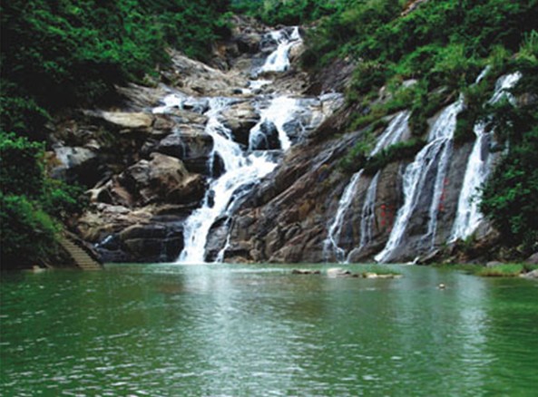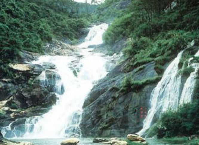 湯泉風(fēng)景區(qū)最有名的當(dāng)數(shù)九龍?zhí)镀俨?。溫泉西北的咫尺之遙,上蒼再顯神靈,又施仁愛,拋下一串“珍珠”———九龍?zhí)镀俨?,它在群山深處奔突而出,拾級而下,一步一潭,至山底第九潭,但見奔雷飛雪而落,蛟龍騰空而降,終聚九龍?zhí)镀俨?。溫泉和瀑布這一暖一涼,地下天上,遙相呼應(yīng),交相輝映,這在現(xiàn)代林林總總的人文景觀大家族中,可謂鳳毛麟角。