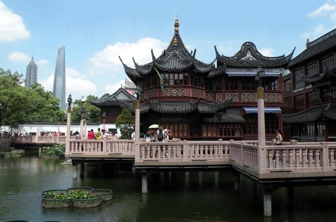 九曲橋九曲十八彎,且每個彎曲的角度大小不一,有大于90度直角的,也有小于90度直角的。九曲橋如今的橋面為花崗石板,每一彎曲處一塊石板上均雕刻一朵季節(jié)性花朵,如正月水仙、二月杏花、三月桃花……直到十二月臘梅;并在九曲橋頭尾的兩塊石板上各雕刻一朵荷花。在湖心亭茶樓門前的一段橋面,中間雕刻一朵荷花,四角則分別雕刻彩云。