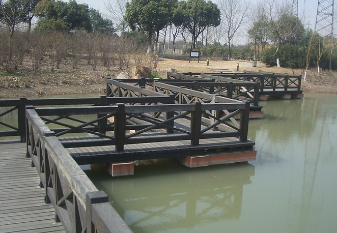 九曲橋九曲十八彎,且每個彎曲的角度大小不一,有大于90度直角的,也有小于90度直角的。九曲橋如今的橋面為花崗石板,每一彎曲處一塊石板上均雕刻一朵季節(jié)性花朵,如正月水仙、二月杏花、三月桃花……直到十二月臘梅;并在九曲橋頭尾的兩塊石板上各雕刻一朵荷花。在湖心亭茶樓門前的一段橋面,中間雕刻一朵荷花,四角則分別雕刻彩云。池中漢白玉的荷花仙女雕塑亭亭玉立,含笑迎候來客。 九曲橋是人文紀念公園三十六景之一,在匯通月潭的上方。九曲橋,顧名思義,是指橋共分成九曲,曲折迂回。“九”是數(shù)字中最大的單數(shù),古有“九九歸一”和“九五之尊”之說,均是對“九”這個充滿吉祥、尊貴的吉數(shù)集中的概括。一、九曲橋是匯通景園三十六景之一。九曲橋,顧名思義,是指橋共分成九曲,曲折迂回。“九”是數(shù)字中最大的單數(shù),古有“九九歸一”和“九五之尊”之說,均是對“九”這個充滿吉祥、尊貴的吉數(shù)集中的概括。橋全長18米,寬2米。全橋由花崗巖和草白玉構(gòu)成,橋下為放生池,橋的兩旁有廊亭,廊亭的兩旁有石桌石凳,在這里或品茶弈棋,或瀏覽風光,讓你感受到世外的悠閑和寧靜。橋體雕刻精美,構(gòu)思巧妙,匠心獨運,巧奪天工。穩(wěn)固堅轉(zhuǎn),寄雄奇于絕倫之里,寓雋秀于精巧之間,每逢晴天,澄清空明,橋倚碧水,曲橋如玉帶浮水、橋水空蒙、水橋一色、波光瀲滟,水波魚動微風起,一池荷蕊滿園香。池內(nèi)蓮花吐珠、荷葉田田,風月無邊。據(jù)證,九曲橋有兩絕:中秋有“九曲印月”和“曲橋泛鯉”之奇景。池中水草如絲、藤蘿蟠結(jié),魚翔淺底,沙鷗錦鱗,景色蔚為精彩,令人嘆為觀止!著名學者祝陽贊譽:“瑤臺失落鳳頭釵,九曲臥水映碧苔;待看中秋明月夜,九曲橋孔照影來。”