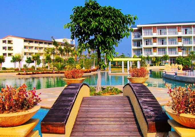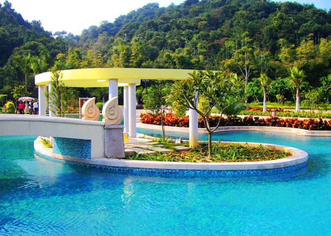 度假區(qū)總占地面積為1000畝。其中首期工程占地面積為500畝,其中設(shè)有別墅區(qū)、溫泉區(qū)、餐飲區(qū)、娛樂區(qū)、健身區(qū)、休閑區(qū)等項目。區(qū)內(nèi)有十分豐富的溫礦泉水資源,溫泉出口處水溫高達82攝氏度,富含大量鈣、鎂、氡等幾十種對人體有益的微量元素,對風(fēng)濕病、腰肌勞損、腸胃病、神經(jīng)性骨痛等多種潛在疾病有顯著療效。目前該度假區(qū)已完成首期工程,并已于2005年9月26日正式對外接待游客。度假區(qū)內(nèi)綠樹成蔭,小河流水,小島別墅區(qū)的形狀猶如一把西施扇,把整個度假區(qū)置身于群山的懷抱中。區(qū)內(nèi)設(shè)施配套齊全,目前設(shè)有575間客房、31棟別墅、三個中餐廳(同時可容納1650人)、兩個西餐廳、歌舞廳、溫泉大浴池、桑拿,以及為顧客提供咖啡廳、茶藝廊、超市、精品屋、大堂吧、游泳池、桌球室、乒乓球室、羽毛球室、大型的高爾夫練球場、網(wǎng)球場、健身房、沐足等各種服務(wù)設(shè)施一應(yīng)俱全。