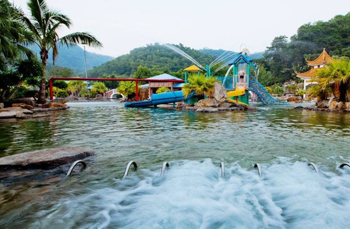 在中國(guó)第一個(gè)溫泉之鄉(xiāng)——恩平市,有一座被環(huán)嶺群峰擁抱著的溫泉山,山下的三十多處自噴溫泉,日流量為6000立方米,其溫泉水溫高達(dá)73℃,水質(zhì)晶瑩幼滑,并含有偏硅酸、氟、氫、硫等多種有益于人體健康的元素,是世界少有的滑溫泉,這就是帝都溫泉。