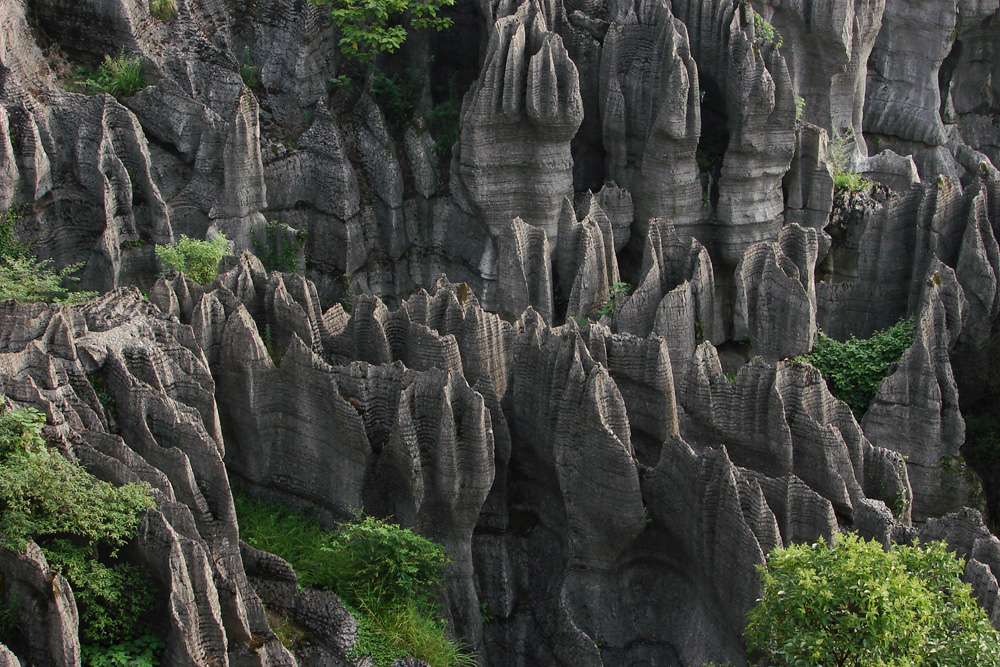 該類景觀典型的喀斯特地貌,表面呈虎皮狀。在這里,群峰壁立,奇峰危石,可謂千姿百態(tài),石門、石寨、石柱等,酷似人工堆疊,卻無人工痕跡;飛禽走獸的石頭,栩栩如生、惟妙惟肖;田園阡陌、炊煙裊裊,清泉碧池,清麗若未施粉黛的閨秀楚楚動人。顯示出萬盛石林景觀的美感與靈性。