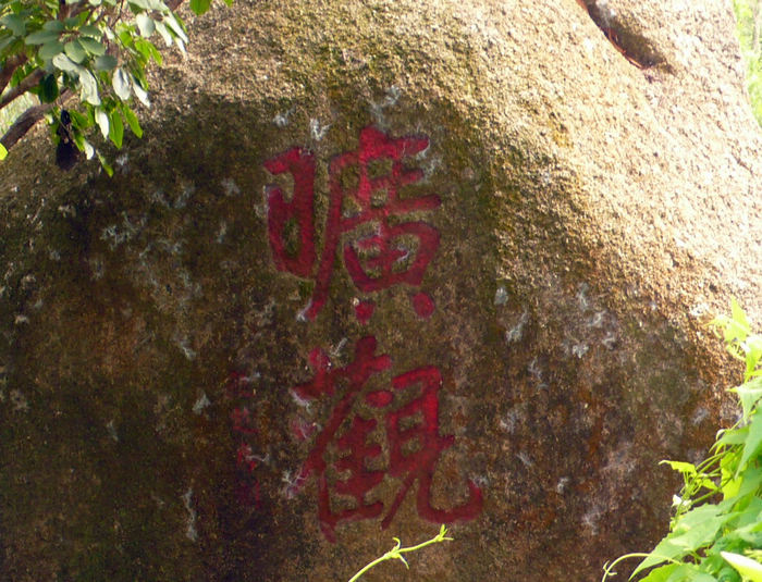登上崖頂"石溪"巖石右側一圓石刻著"曠觀"兩字。南眺遠山如黛,玉盤一樣的香洲區(qū)盡收眼底。當年名士多聚于此,豪飲放歌賦詩懷古,留下累累筆墨石刻,因年代久遠,現(xiàn)存僅三十余處。石溪摩崖時刻群大多取意于環(huán)境、石貌、如"茂林修竹"、"樵徑"等游人至此,如臨一座書法展覽館,趣味橫生。
