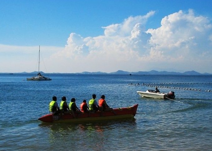 香蕉船是驚險、刺激的海上娛樂活動之一。香蕉船形似香蕉狀而得名,坐在香蕉船上由一艘快艇以50公里/小時的時速拉著在海上飛馳,隨著海浪的起浮,香蕉船猶如一匹脫韁的駿馬自由穿梭在碧藍的大海之中。