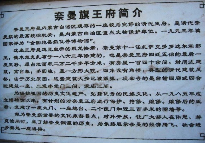 現(xiàn)已對(duì)外開(kāi)放,有七個(gè)陳列室,全面反映了昔日王府概貌及奈曼旗的歷史沿革,很受游人的歡迎。