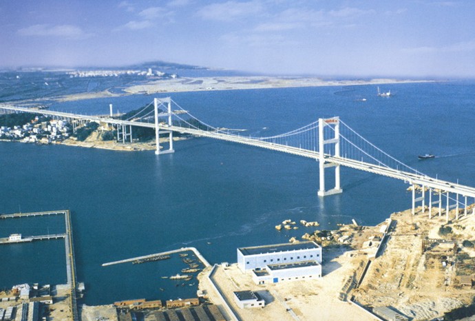 位于汕頭港東部出入口媽嶼島海域處,為跨海公路橋。橋面跨越礐石海, 全長2500米。由3部分組成:南面是跨黃沙灣南航道的預應力鋼筋混凝土加大橋勁梁懸索橋;北面是跨北航道的預應力鋼筋混凝土梁式橋;中部為橫跨媽嶼島上的預應力高架旱橋。橋主孔通航凈跨度452米,通航凈高46米,可以通過5萬噸級船舶。這座大橋是深汕兩地一級汽車專用公路的配套設施,是連結深圳、珠海、汕頭、廈門等4個經(jīng)濟特區(qū)的陸地交通紐帶。