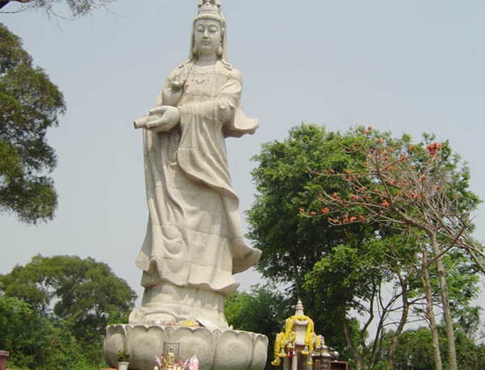 它落成于1994年5月29日,雕藝高超,面容端莊,惟妙惟肖,其左手拿甘露瓶,瓶口向下;右手執(zhí)柳枝,拈露灑人間,形象動(dòng)人。這座高達(dá)12米(含蓮座2米),由總重10多萬(wàn)公斤108塊石雕砌成,當(dāng)時(shí)是由市工藝美校設(shè)計(jì),惠安縣石雕高手刻后遠(yuǎn)途載來(lái)。其左豎一石燈。又有冊(cè)形石板刻著詩(shī)僧定持所書二詩(shī),韻妙墨妍。