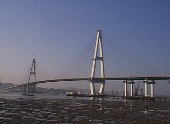汕頭礐石大橋南起國道324廣汕公路,跨越汕頭海港,北與國道206線聯(lián)接,是繼汕頭市市區(qū)東部建成的海灣大橋后動(dòng)工興建的第二座特大型跨海大橋,總概算人民幣12.5億,大橋正橋全長2865米,全橋包括互通立交,引橋匝道、引道總延長米為5976米。全橋六車道,兩側(cè)加設(shè)人行觀光道,橋面總寬30.5米。主塔塔身高148米,主橋主跨518米,通航凈高38米,可通航2萬噸級(jí)船舶。大橋主橋鋼絞線斜拉索和鋼箱梁與PC梁混合梁的結(jié)構(gòu),為我國首例,技術(shù)先進(jìn),氣勢(shì)磅礴,大橋于1998年12月建成。礐石大橋的建成將與海灣大橋形成跨海交通環(huán)線,對(duì)推動(dòng)和改善汕頭市投資環(huán)境和發(fā)展經(jīng)濟(jì)起到重大的作用。