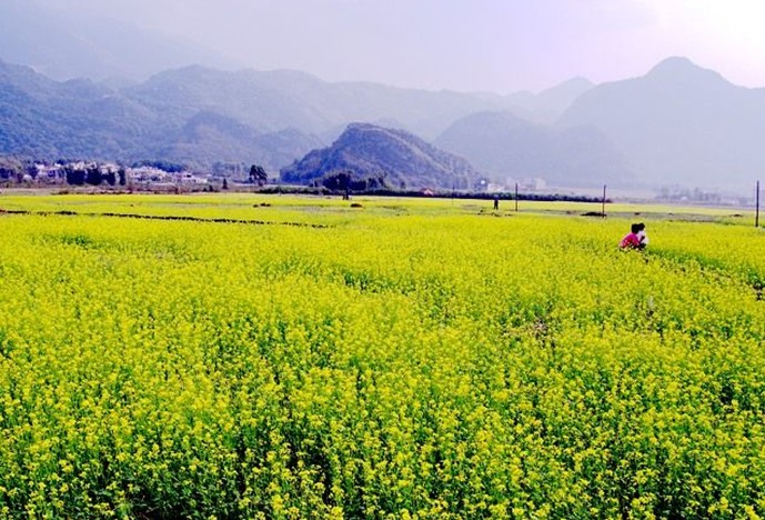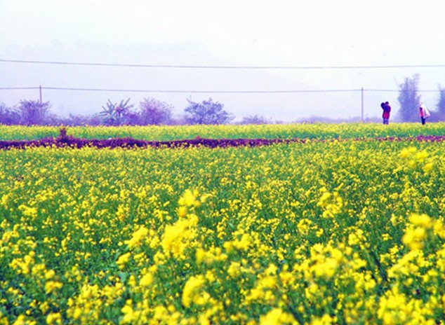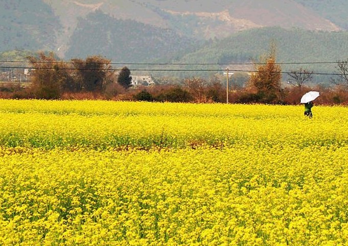 油菜花期,葉少枝繁,虬須互繞,姿豐勢(shì)旺。朵朵黃花巧著翠莖,緣下盤上,漸次綻開,撫枝細(xì)點(diǎn),單株菜花均超千朵,體碩株壯者則花數(shù)難計(jì)。當(dāng)微吹吹過(guò),花朵輕搖,田野里一望無(wú)際的金色花海便仿若一層層的波浪,高低起伏,不斷向游人涌來(lái),百里飄香。
