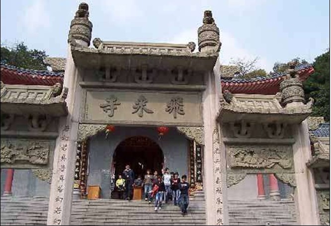 該寺位于廣東清遠(yuǎn)市北江小三峽處的飛來寺,相傳是從安徽飛來,故名飛來寺。相傳在梁武帝普通元年(公元520年),軒轅黃帝的兩個庶子太禺和仲陽隱居在飛來峽。一個月明之夜,他們邊飲酒、邊作樂、邊欣賞眼前這峰巒疊嶂、江水凝碧、漁火點點的夜色時,總是感到有點美中不足,缺少點什么東西?猛然間醒悟:對,就是缺少一個道場,當(dāng)即,他們駕起祥云,來到安徽舒州上元的延祚寺,對住持貞俊禪師說:“峽居清遠(yuǎn)上游,千峰拱主,悉若佑命,所稱福地是也。吾欲建一道場,立勝概,師居乎?”貞俊禪師不好拒絕,也不好作答,只是微點了下頭。夜靜,太禺與仲陽作法,一時行雷閃電,風(fēng)雨大作,把整座延祚寺凌空拔起搬往廣東。次日,貞俊禪師早起,發(fā)現(xiàn)寺院已在清遠(yuǎn)峽山,心中不悅,口中念念有詞:“寺能飛來,胡不飛去?”空中傳來話語:“動不如靜!”從此,這寺院就落地生根,留在了飛來峽。