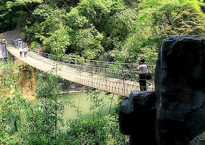 仙人橋位于縣城西南40余公里處的洛陽(yáng)鎮(zhèn)半星雷屋村,高山斜坡上、綠樹(shù)掩映間,有大、小拱天然仙人橋兩座,屬石灰?guī)r溶蝕地貌景觀。大拱橋高70米,寬50米,長(zhǎng)150米,小拱橋更為壯觀,高約138米,內(nèi)拱高106米,寬53米,長(zhǎng)約156米,在大拱仙人橋的入口處,有峰巒延綿,勢(shì)如雄獅回首南望,獅身高約38米,長(zhǎng)約60米,獅頭、獅眼因石灰?guī)r溶蝕脫落而成,形成了“雄獅回頭”的獨(dú)特景觀。