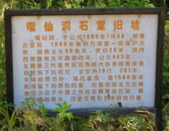1980年7月,考古工作者在洞內發(fā)現(xiàn)了北魏太武帝拓跋燾于公元443年(太平真君四年)派遣中書侍郎李敞祭祖時所刻的祝文。祝文刻在距洞口很近的西側石壁上,共19行201字。字體古拙,介于隸楷之間。這一重大發(fā)現(xiàn),證明了嘎仙洞就是《魏書》中提到的拓跋鮮卑的祖廟石室。