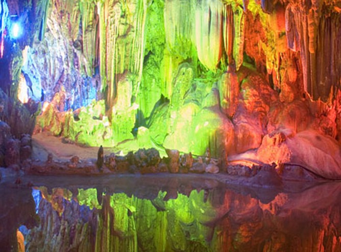 進(jìn)入洞口的第一景就是古佛殿,由石幔、鐘乳石組成的獨(dú)具一格的佛殿內(nèi),三座小石筍錯(cuò)有致,恰似三尊佛像。他們相貌莊嚴(yán)而又安詳,殿內(nèi)佛光普照,令人肅穆。離佛像10米處有一石柱如巨大的古榕,挺撥聳立,枝葉繁茂,被稱為 “古榕疊翠”。古榕底下是三五成群的“牧童”牽著“牛群”,踏著斜輝歡樂而歸。古榕的旁邊還有一個(gè)通天幽洞,大洞疊著小洞,給這美妙的景色又增添了一層神秘的色彩。 穿過石巷曲徑,便到了觀音殿。只見一座白色石筍,如一座盛開的荷花,花中坐著慈目低垂的“觀音”菩薩。觀音旁邊那座石筍象是抱著孩子的送子娘娘。周圍無數(shù)的小乳石就象一群群前來朝拜的仙人。其中一尊如太白金星在拱手相迎。所有這些形象生動(dòng)地構(gòu)成了一個(gè)“紫竹松林”的境界。在觀音殿對面是蓬萊仙島的奇異景觀,蓬萊是傳說中的海上仙山,它奇特之處在于海上出現(xiàn)的海市蜃樓景象。這里的景色海天茫茫,空照澄碧,遠(yuǎn)方的海市隱約可見,那紅色呈拱狀的地方象是一座城門,里面各式建筑星羅棋布,景象萬千。