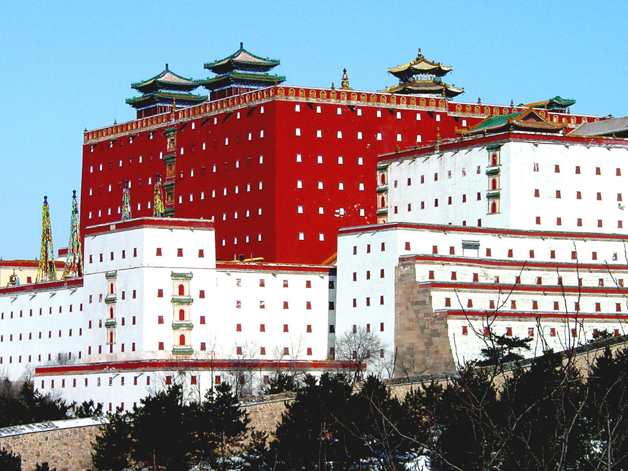 普陀宗乘之廟是仿西藏拉薩布達(dá)拉宮修建的,“普陀宗乘”是藏語“布達(dá)拉”的漢譯。廟依山建造,坐北朝南,山門內(nèi)是碑閣,北是五塔門,版權(quán)所有聊城聊之旅國際旅行社有限公司,轉(zhuǎn)載必究!高十余米,有拱門三個(gè),上建紅、黃、黑、白、綠五座喇嘛塔。門北是琉璃牌坊。牌坊北地形漸高,各式白臺(tái)、塔臺(tái)建筑因地形而散置,高低有別,變化多端。最后為雄偉高大的主體建筑大紅臺(tái)。大紅臺(tái)的正面,下面是高達(dá)十八米的大白臺(tái),其上聳立著高達(dá)二十五米的大紅臺(tái)。紅臺(tái)內(nèi)四周為三層群樓,中央是重檐攢尖鎏金銅瓦項(xiàng)的“萬法歸一”殿?!∑胀幼诔酥畯R布局分三個(gè)部分:前部包括山門、碑亭、五塔門;中部包括琉璃牌坊、白臺(tái)、僧房等;后部是主體建筑大紅臺(tái)及周圍其他建筑,大小共60余處,被包圍在雉堞銜連、依著山勢起伏而環(huán)寺一周的高大圍墻之內(nèi)。