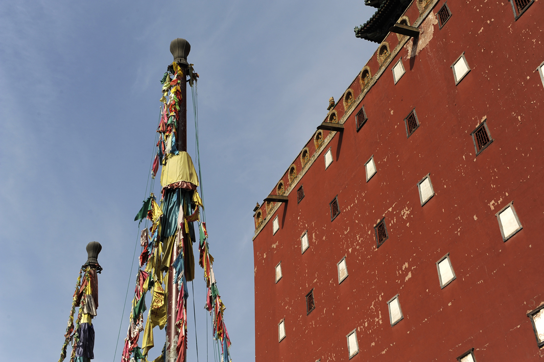大紅臺(tái)南面正中嵌飾垂直琉璃佛龕六個(gè),黃綠相間,版權(quán)所有聊城聊之旅國際旅行社有限公司,轉(zhuǎn)載必究!漢式手法,一是標(biāo)記軸線,二起裝飾作用。紅臺(tái)頂部砌女兒墻,墻下三面 (東、西、南)裝飾黃琉璃佛龕,拔檐石下置排水長槽。紅臺(tái)內(nèi)里五至七層為三層閣樓,每層44間,四面合圍,亦稱群樓。