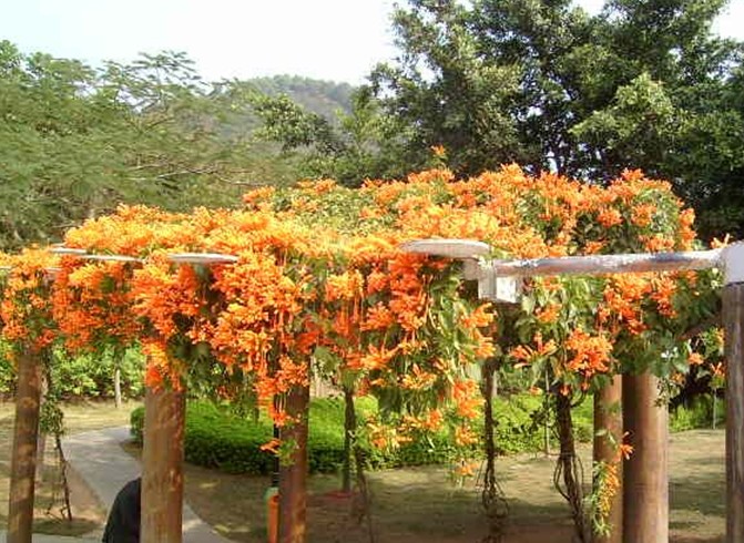 人工疏林草地植被樹(shù)木種類(lèi)較多,層次較簡(jiǎn)單,林木主要有南洋楹、檸檬桉、白千層、鳳凰木、蒲葵等20多種,林下植物主要以毛杜鵑、龍船花等植物為主;園內(nèi)綠化特色樹(shù)種為美麗異木棉、宮粉紫荊等植物。緩坡地種植的毛杜鵑每到開(kāi)花季節(jié)漫山一片通紅,景色非常優(yōu)美。環(huán)山路邊的二喬木蘭、美麗異木棉,到了開(kāi)花季節(jié)沿路色彩斑斕,自然景觀非常壯麗。“2002-2003年,靠北環(huán)路邊以杉木、馬尾松、馬占相思為主的人工林,由于結(jié)構(gòu)單一,并已老化,已進(jìn)行了林分改造,在保留鴨腳木、山烏桕、野漆樹(shù)等具有景觀效果的野生樹(shù)種,混交配置了鳳凰木、大葉紫薇、火焰木、美麗異木棉、宮粉紫荊、紅花荷等骨干樹(shù)種,形成了層次鮮明,景觀效果高的生態(tài)風(fēng)景林。山脊線(xiàn)主要是以荷木、大葉相思、臺(tái)灣相思組成的防火林帶。”筆架山公園管理處負(fù)責(zé)人向記者介紹,“為給廣大市民呈現(xiàn)多姿多彩的公園景象,我們?cè)?003年沿北環(huán)繞路邊山體種植了彩色林、紫荊花樹(shù),改變公園單一色彩,興建彩色林帶。”現(xiàn)在,公園綠化面積40多萬(wàn)平方米,種植喬灌木5萬(wàn)多株,形成層次明顯、色彩較為豐富的景觀。
