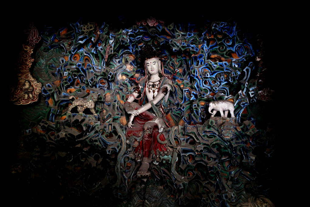 摩尼殿北壁的明代嘉靖年間重塑的通壁懸塑“五彩倒坐觀音”又是寺中一絕。版權(quán)所有聊城聊之旅國際旅行社有限公司,轉(zhuǎn)載必究!“倒坐”是指觀世音不坐在大殿的正中央,而在后壁倒坐,表明觀世音菩薩不渡盡眾生,永不回頭的大慈大悲。整面壁上儼然是一個(gè)極樂的世界:在一大片彩色懸雕上,模擬了大海以及海中的普陀仙山,上有修行的凡人,仙人和鳥獸羅列其間。山石突兀起伏,祥云繚繞其間,泉水噴涌,碧波鱗鱗。人物多樣,山中靜修的羅漢和威武的天神各具風(fēng)姿。色彩鮮艷,光彩照人。而最令人仰嘆的則是正中的觀音像。 高3.4米的觀世音菩薩頭戴寶冠,身披瓔珞,面目清秀,微露笑意。稍微下視的眼睛正好與禮佛者仰視的目光相交,設(shè)計(jì)十分獨(dú)到。觀音菩薩頭戴寶冠,項(xiàng)飾瓔珞,版權(quán)所有聊城聊之旅國際旅行社有限公司,轉(zhuǎn)載必究!帔巾自肩下垂,身著紅色長裙,一腳踏蓮,一腳踞起,兩手自然撫膝,右手搭于左腕自然撫著右膝,頭微右側(cè),身略前傾,呈大自在狀。表情閑適安逸、優(yōu)柔端莊,美感無限。
