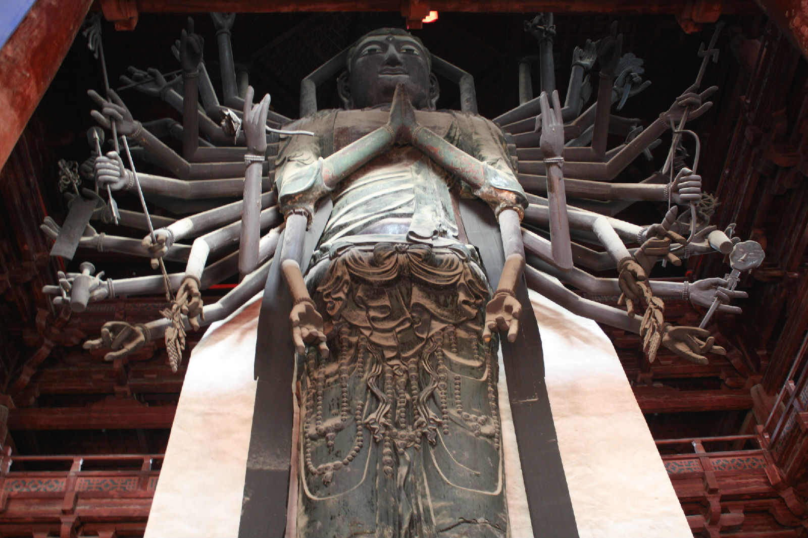 大悲閣是隆興寺的主體建筑,坐落在中軸線後部。閣前古柏參天,閣後老槐吐翠,周圉蒼松、百花環(huán)繞,景色清幽宜人。閣高33米,面闊七間,進(jìn)深五間,為五重檐三層樓閣。舊名“佛香閣”、”天寧觀音閣”。據(jù)記載,該閣始建于968-976年(宋初開寶年間)。大悲閣內(nèi)矗立著一尊高大的銅鑄大菩薩,稱“大悲菩薩”,高19.2米,立于2.2米高的須彌石臺上,是中國保存最高的銅鑄觀音菩薩像。像奉宋太祖趙匡胤敕令而造,周身有42臂,又稱“千手千眼觀音”。各臂分持日月、凈瓶、寶塔、金剛、版權(quán)所有聊城聊之旅國際旅行社有限公司,轉(zhuǎn)載必究!寶劍等,可惜兩側(cè)4o雙銅手臂均被毀,已改為木制,僅前胸兩臂為原鑄。觀音像神態(tài)自若,比例均勻,衣紋流暢,線條細(xì)膩,頗具宋代藝術(shù)風(fēng)格。據(jù)寺內(nèi)一通宋碑記載,其鑄造程序是:先鑄好基礎(chǔ),然后分七節(jié)鑄造大菩薩。第一節(jié)鑄下部蓮花座,第二節(jié)鑄至膝蓋,第三節(jié)鑄至臍下,第四節(jié)鑄至胸部,第五節(jié)鑄至腋下,第六節(jié)鑄至肩膊,第七節(jié)鑄至頭部。最后添鑄四十二臂。菩薩的手均為木雕而成,其上裹布,一重漆,一重布,然后用金箔貼成。