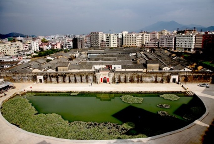 大萬(wàn)世居坐落在深圳市龍崗區(qū)坪山街道大萬(wàn)路33號(hào)坪壞社區(qū)西南的客家村,為古堡式客家圍龍屋建筑。建于清乾隆年間(1736-1795年),規(guī)模宏大,占地1.5萬(wàn)平方米。平面呈方形,四角建有炮樓,正面有大六樓,均為高高的圍墻相連,圍墻上有走馬廊相通。圍龍屋大門向南,門樓上塑有“大萬(wàn)世居”4個(gè)大字。大門前為禾坪,再前是月形池塘,禾坪側(cè)仍保留有旗桿石。