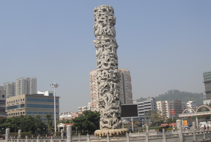 廣場分為三個區(qū)域:北端是集會區(qū),以半圓形主席臺為標志,可舉行大型演出或舞會;中部是游覽區(qū),建有大型白色花崗巖石雕九龍柱,高19.99米、直徑3米、雕刻浮度為60厘米,總重量為260噸,配置噴水池直徑28米,水池周邊采用花崗巖“二龍戲珠”浮雕扶欄,欄間嵌有8條1.99米高小龍柱。噴水由里向外形成落差,分段迭灑,錯落有序。
