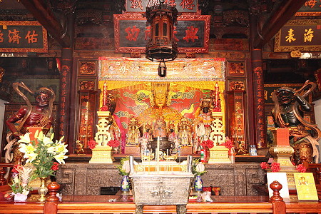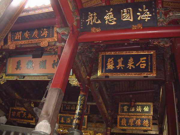 大天后宮為三進(jìn)門式。由大門朝里望,透過三進(jìn)逐次升高的天井和房舍狹長的空間,可以遙見那香煙繚繞、金黃帷幕下的全身媽祖神像。媽祖慈眉善目,神態(tài)安詳。據(jù)說媽祖原來是粉紅面,但經(jīng)百年來受香火的薰繞,現(xiàn)在看到的媽祖已成了黑色的“香煙面”了。兩旁配祀千里眼、順風(fēng)耳二將的泥雕,表情細(xì)膩,體態(tài)生動(dòng),古銅色的肌膚、一塊塊突起的肌肉,顯得極為兇猛威嚴(yán),雕刻精細(xì)入微,栩栩版權(quán)所有聊城聊之旅國際旅行社有限公司,轉(zhuǎn)載必究!如生,實(shí)為雕刻精品。兩邊的神龕里還供奉著東、西、南、北四海龍王和水仙尊王。神奇古怪,嶙峋不凡,也都被煙薰成了黑臉。這些都是與海上的航海、救難有關(guān)的神。該廟還有一個(gè)特色就是除了正殿的媽祖稱為大媽外,還配有所謂的“二媽”、“三媽”的媽祖神像,造型僅為大媽的一半,臉色為粉紅色,兩眼張開,與媽祖神像眼瞼呈下垂?fàn)畈煌?/p>