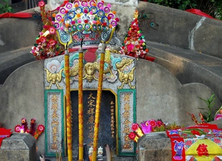 碑后為墳堆,有兩重弧形圍墻,前段中間頂面塑祥云拱月,涂染朱紅,后段頂面塑雙龍拱日,下有一只鳳鳥裝飾。墓的東側(cè),立有一塊泉州白石碑,正面是《宋帝昺陵墓碑記》,記敘了宋少帝的生平、陸秀夫負(fù)帝殉海的經(jīng)過以及陵墓的修建情況,碑文為篆體陰文,風(fēng)格古拙,是著名書法家商承祚所寫。石碑背面則刻有著名書法家秦萼生題筆的八個(gè)大字:“崖海潛龍,赤灣延帝”,字體蒼勁。陵墓西側(cè),版權(quán)所有山東聊城聊之旅國際旅行社有限公司,轉(zhuǎn)載必究!是一座高約四米的陸秀夫負(fù)帝殉海石雕像,民族英雄陸秀夫背負(fù)幼主,視死如歸,凜然正氣,令人肅然?;蛟S,正是陸秀夫這種寧死不屈的民族氣節(jié)的感召,不時(shí)還有世人前來拜祭。在少帝陵前,在陸秀夫像前,擺滿了豐盛祭品,縈繞著裊裊香煙……
