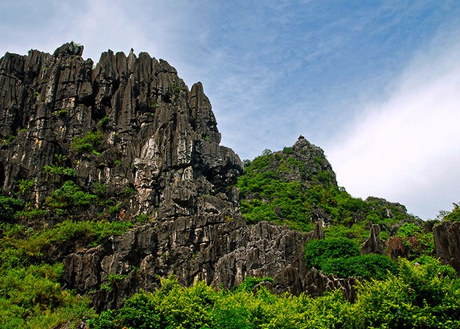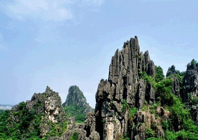 春灣石林,又名“蓮花洞石林”,位于陽(yáng)春市春灣鎮(zhèn)春灣風(fēng)景區(qū)內(nèi),占地200多畝,山上有馬頭峰、駱駝峰、蓮蓬峰、蛤蚧石、觀音拜月石、仙人過(guò)坳石、百頁(yè)劍門(mén)等怪石。從百頁(yè)劍門(mén)進(jìn)入石林中,石峰奇突,景象萬(wàn)千。有似“童子拜觀音”、“猛獅過(guò)嶺”、仰天嗥叫的野狼像等石頭。春灣石林位于陽(yáng)春市,距龍宮巖600米,是一大片石林,由"百頁(yè)劍門(mén)"、"馬頭峰"等6座石山峰巒組成,最壯觀的是石劍峰(也叫百頁(yè)劍門(mén)),如刀槍劍戟,挺拔陡峭、直插云天。