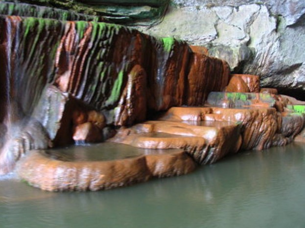 陽春玉溪三洞全長3公里,均可坐船瀏覽。第二洞長330米,水深2-5米,水面寬20-30米,河水清澈如玉,水中多生長鯉魚。洞中景物豐富,尤以“三變石”為趣,詩人張永枚曰:“遠(yuǎn)似漁翁釣清流, 近如獅子滾繡球,忽變犀牛望明月,一石三景迷輕舟”。第一洞頂?shù)?ldquo;皇冠”石,酷似皇冠,游人在船上隨即可拍攝一幅頭戴皇冠的照片。第一洞長400米,上面有一層旱洞,水面距洞頂高48米,該洞以“金盞疊泉”最為壯觀,一個個金黃色的石盞滿載清澈的泉水往下流。詩人韋丘贊道:“串玉溪穿三洞天,柔情碧水石能言,聲聲燕語留歸客,舉漿猶疑落漿難”。