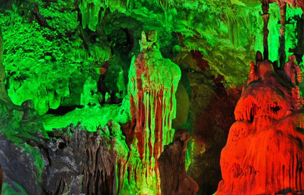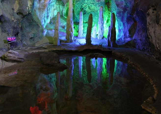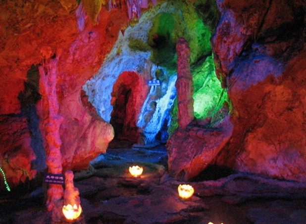 蟠龍洞的特殊景觀有三外:其一是世界三大石花洞之一。洞內(nèi)石花剔透玲瓏,晶瑩如玉,它附著于巖壁之上,不按重力方向生長(zhǎng),版權(quán)所有山東聊城聊之旅國(guó)際旅行社有限公司,轉(zhuǎn)載必究!而向四面節(jié)節(jié)開(kāi)花,見(jiàn)氣成石,繼續(xù)生長(zhǎng),變幻無(wú)窮。其二是我國(guó)南方典型的大熊貓--劍齒象動(dòng)物群"古動(dòng)物化石區(qū)",最為珍貴的是"智人"古人類化石。其三是蟠龍洞尚未開(kāi)發(fā)的龍泉地下河,河中有泉眼,每隔十分鐘左右,泉眼波浪翻滾,似海潮洶涌,沖刷河岸,隨后又似退潮,靜靜地回流石洞,經(jīng)專家確認(rèn)為地下間歇泉,是一罕見(jiàn)洞府奇觀。洞長(zhǎng)千米,深暗幽邃。里面有高達(dá)30米的螺頂,有深不見(jiàn)底的石罅,寬闊空曠處都能容千人,窄處不能2人并行。在洞內(nèi)跺腳砸壁會(huì)發(fā)出“嗡嗡”回音,給人一種神秘莫測(cè)的感覺(jué)。洞口朝南,為券拱門,門上坎刻“龍洞熏風(fēng)”四個(gè)篆字,為康熙14年5月立。洞內(nèi)10米處,有一供臺(tái),臺(tái)上神像已廢,只剩臺(tái)下殘存的幾尊羅漢石像身軀。向洞內(nèi)行至30米處,開(kāi)始向右下方拐彎,回頭外望,只見(jiàn)洞口猶如月牙出山,人稱“回首望月”。繼續(xù)前行,步步廳景。鐘乳石形成的“火燒葡萄架”含珠點(diǎn)翠;石壁上被浸蝕成的“仙人炕”形體逼真;巨石橫貫的“仙人橋”奇特驚險(xiǎn),世間罕見(jiàn)。再向里進(jìn),八戒可見(jiàn)鐘乳石形成的“江豬探海”、“水簾瀑布”、以及多年沖刷而成的“姜池”、“藕池”,池內(nèi)形似鮮姜的鐘乳石如霞似錦。“蓮藕”如雪似玉。“玉龍騰空”尤惹人注目:在高達(dá)20米的洞壁上,有一塊鐘乳石,宛若玉龍,通體覆蓋著銀光閃爍的“龍鱗”,妙不可言;龍頭垂下,嘴里噴球吐玉人,人稱“龍滴水”,滴在下面“蓮花盆”里,四時(shí)不涸。“鷂子翻身”是洞內(nèi)向下延伸的地方,此處游人不能正面行進(jìn),必須翻過(guò)身子,雙手攀石倒行;路旁有深不見(jiàn)底的石罅。走過(guò)險(xiǎn)境,是一段空闊平坦的地帶,版權(quán)所有山東聊城聊之旅國(guó)際旅行社有限公司,轉(zhuǎn)載必究!這兒路面干燥,清風(fēng)習(xí)習(xí)。再向里前進(jìn),便是“倒爬四十步”,雖然路程難走,卻另有一番意境。再向前行200米,有巨石擋堵,不能前往。洞口外200米處為金代佛隱寺遺址,存戲臺(tái)和石碑1通、古柏1株。漫山蒼松翠柏,郁郁蔥蔥;山下溝壑幽深,樹(shù)林茂密。