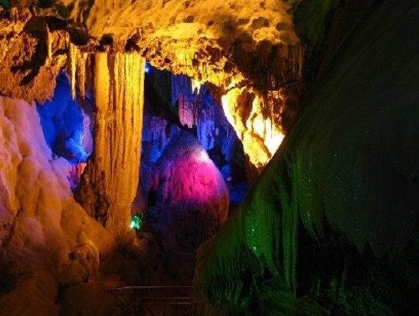 云浮蟠龍洞風(fēng)景名勝區(qū)位于廣東省云浮市區(qū)北部的獅子山中,是一個(gè)經(jīng)歷了1.7億多年逐漸形成的次生溶洞。洞分3層,上為天堂通天洞,下為龍泉地下河,中為九龍長(zhǎng)廊。蟠龍洞屬喀斯特溶洞,洞內(nèi)石花高懸,鐘乳低垂,石筍石柱如林,石幔、石帳、石盾、石堤應(yīng)有盡有,奇景疊出,洞體迂回曲折,形若蛟龍,故得名"蟠龍洞"。蟠龍洞屬喀斯特溶巖,經(jīng)歷億萬(wàn)年漫長(zhǎng)歲月逐漸形成。洞內(nèi)游程528米,分三層,上層天堂通天洞,下層龍泉地下河,中層九龍長(zhǎng)廊,層層相連,曲折迷人。洞內(nèi)鐘乳千姿百態(tài),石筍石柱如林。處處有景,景景皆奇。類人似物有“神龜朝圣”、“龍母浴池”“天書神筆”、“玉壁雄關(guān)”等58景,真是惟妙惟肖,栩栩如生,引人入勝。版權(quán)所有山東聊城聊之旅國(guó)際旅行社有限公司,轉(zhuǎn)載必究!而最為奇特的是洞內(nèi)巖壁上長(zhǎng)出的簇簇石花,石花晶瑩潔白,剔透玲瓏,如銀星閃爍熠熠生輝。