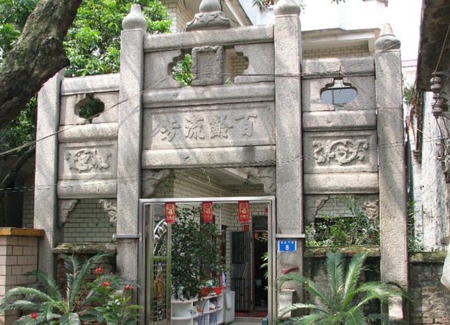 百齡流芳坊位于廣東省中山巿黃圃鎮(zhèn)鎮(zhèn)一村,建于清代道光十八年(1838年)。為四柱三間通天式牌坊,以花崗石雕鑿構(gòu)筑,高5米。正面主間上豎刻“圣旨”(陽(yáng)刻)二字,下方橫匾陽(yáng)刻:“百齡流芳”四字,上款陰刻“道光戊戌”,下款陰刻“何高啟立”。背面上豎刻“恩榮”(陽(yáng)刻)二字,下方橫匾陰刻:“升平人瑞”四字。