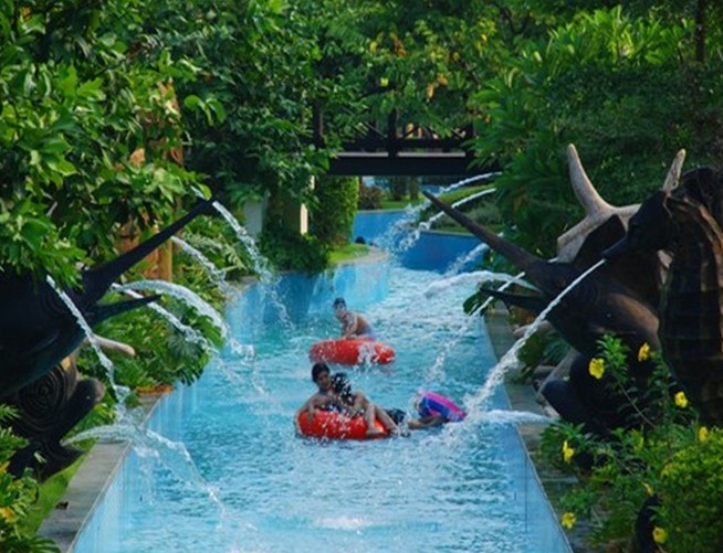 廣東最大的原生態(tài)熱帶雨林主題游樂區(qū),擁有各種不同的水滑道和玩水活動。當屋頂?shù)拇竽就把b滿水時就會傾倒而下,讓您享受如瀑布般的清涼快感!特別為兒童設計,擁有多套適合小朋友和家庭游玩的大小型水娛樂設施,既是孩子們的樂園,也是家庭放松的理想之所。