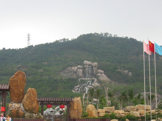 由我國園林名石——廣東英石、江蘇太湖石以1:1000倍比例按廣東嶺南派著名畫家林風(fēng)俗教授的水墨山水名畫——“天下第一盆景”為藍(lán)本放樣砌成。
