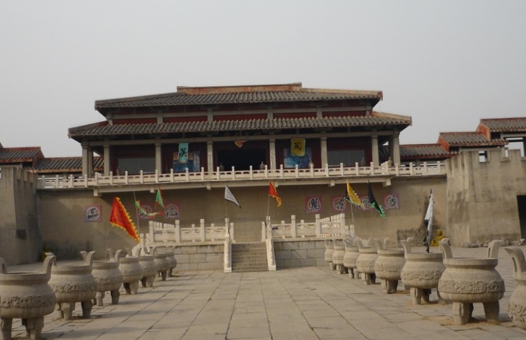 正門闊大壯嚴(yán),十八座大石鼎羅列主甬道兩側(cè),祭壇欄桿玉石雕成,祭壇廣場青石鋪就,城堡四周戰(zhàn)旗林立,魏武堂前魏、蜀、吳三面錦旗威風(fēng)凜凜。