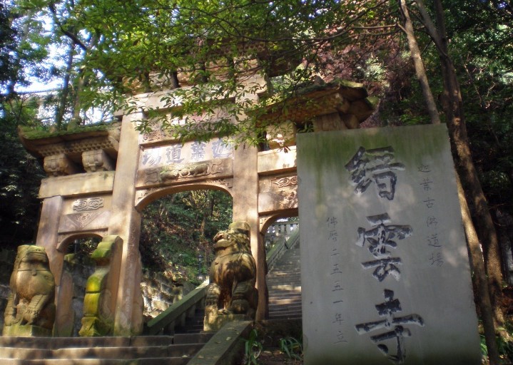 縉云山是具有1500多年歷史的佛教勝地。山中縉云寺,始建于南朝劉宋景平元年(423年),后曾稱“相思寺”、“崇勝寺”、“崇教寺”,受到歷代帝王封賜。寺中自古辦學(xué),名為“縉云書院”。寺內(nèi)現(xiàn)存有宋太宗誦讀過的24部梵經(jīng)。寺外石照壁上“豬化龍”浮雕,為六朝文物。另有出土的石刻天王半身殘像,據(jù)傳是梁或北周作品。唐高祖李淵(618年)曾親筆題名“禪真宮”,唐大中元年(847年),宣宗皇帝賜寺額為 “相思寺”,系山有相思巖、相思竹、相思鳥之故。唐乾符元年(874年),定濟和尚重建寺廟,971年慧歡禪師主持修葺殿宇。998年,宋真宗將太宗讀過的梵經(jīng)240卷送到這里,供奉在寺中。宋景德四年,真宗賜名“崇勝寺”。明永樂五年成祖皇帝敕諭“縉云勝景”,明天順元年(1462年)英宗皇帝又踢名“崇教寺”,萬歷三十年神宗皇帝下令改為縉云寺,賜題“迦葉道場”。明末清初,寺毀于火災(zāi).傳說是因為當(dāng)時寺內(nèi)和尚,橫行四鄰,當(dāng)?shù)乩习傩蘸拗牍?,趁張獻忠入川時,聚眾上山一把火把寺燒毀,現(xiàn)存的寺廟是清康熙二十二年(1683年)由破空和尚主持修復(fù)的。1930年秋,曾任世界佛學(xué)苑苑長、中國佛教學(xué)會會長、中國佛教整理委員會主任的太虛大師(1889-1947)“游化人川”,得知四川劉湘有“選派漢人入藏”之意,乃建議成立漢藏教理院,以研究漢藏教理,融洽中華民族,發(fā)揚漢藏佛學(xué),增進世界文化交流,得到了渝州(今重慶)軍、政、金融界知名人士的大力支持,遂選定縉云寺作校址,推選劉文輝為名譽院長、太虛為院長、何北衡為院護,共同組成漢藏教理院董事會。該院辦學(xué)20年,為我國培養(yǎng)了大批佛教人才。當(dāng)年學(xué)生現(xiàn)遍及世界各地,重慶佛教協(xié)會會長惟賢法師等均是太虛法師的學(xué)生??N云寺漢藏教理院號稱世界佛學(xué)苑四大分院之一。寺內(nèi)大雄寶殿上塑有迦葉古佛,高約2米。兩旁站立帝釋、梵天,都是清代塑像。其外有一匾額,上書“曇花藹瑞”。寺內(nèi)還有一口大鐵鐘,高約1.60米,底徑1.50米,腰徑0 9米,為清道光二年(1822年)所鑄。山門外,兩棵參天銀杏直向青天,古剎鐘聲與山間松濤相映成趣。寺內(nèi)的雙柏精舍為方丈居室,兩側(cè)禪房與石刻,形成古色古香的意趣。在寺 外,還存有世界佛學(xué)苑漢藏教理院碑記及太虛法師和正果法師塔各一座,上有趙樸初和鄧穎超的親筆題字。