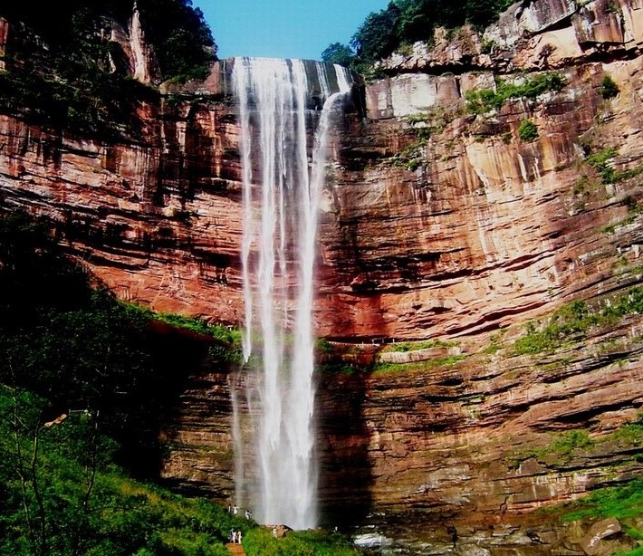 此瀑宛如一條潔白的哈達(dá),懸垂于綠樹紅巖之中。瀑布高約89米,寬約9米。三面赤壁環(huán)回,將銀瀑揉成簇簇絮團(tuán),版權(quán)所有山東聊城聊之旅國際旅行社有限公司,轉(zhuǎn)載必究!斜飄深谷,形成節(jié)節(jié)梯形水簾,陽光射水霧,彩虹凌空,煙霧滿谷,蔚為奇觀。
