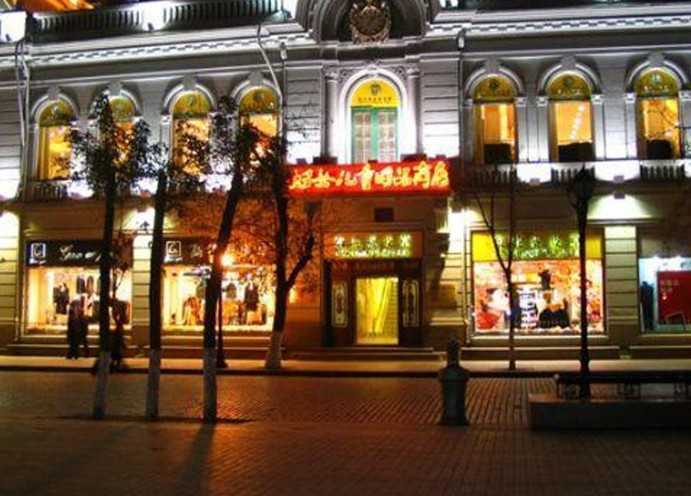 原為俄國(guó)商人伊•雅•秋林開(kāi)辦的秋林商行道里分行。建于20世紀(jì)初期,磚木結(jié)構(gòu),仿文藝復(fù)興建筑風(fēng)格。首層以連續(xù)的腰線分割,墻面采用仿塊石砌筑,二層為對(duì)方額高窗,窗口上有石膏花飾,與一層的大玻璃窗相對(duì)應(yīng)。檐上做間斷的女兒墻,上面飾以巴洛克式浮雕,建筑頂部的轉(zhuǎn)角突出,屋頂輪廓富有變化,檐口下有精美的裝飾造型。哈爾濱Ⅱ類保護(hù)建筑。