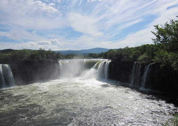 吊水樓瀑布,又稱鏡泊湖瀑布,它位于黑龍江省寧安縣西南,從牡丹江市向南經(jīng)古城寧安,再向西行抵達(dá)東京城后,從這里一直行駛30公里,便可抵鏡泊湖的北湖頭。瀑布幅寬約70余米,雨水量大時,幅寬達(dá) 300 余米。落差 20 米 。它下邊的水潭深 60 米 ,叫“黑龍?zhí)丁?。每逢雨季或汛期,水聲如雷,激流呼嘯飛瀉,水石相擊,白流滔滔,水霧蒸騰出繽紛的彩虹。它形狀好像加拿大亞尼亞加拉大瀑布,是世界最大的玄武巖瀑布。