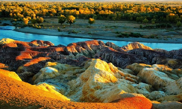五彩灘的特別,還由于它色彩絢爛,形狀繽紛。因為這里有侏羅紀時代的煤層,經(jīng)過千萬年風(fēng)蝕雨剝以及河水的沖刷,在幾乎寸草不生的河灘上出現(xiàn)了紅、綠、紫、黃、棕等鮮艷的色彩。在河水的映襯和夕陽的照射下,當你走進這高低起伏的“丘陵”地帶,就如同走進一個五彩斑斕夢幻般的世界,那些光怪陸離的色彩從四面八方撲面而來,都是那么明快、那么強烈、那么豐富多彩,真讓你感到目不暇接,眼花繚亂。除此之外,五彩灘又仿佛是一個造型奇特的天然泥塑館。這里既有形狀各異的山川高原,又有大小石峰、石墻、石柱、疏密相生,既有雄風(fēng)大氣,又有似水柔情。而形成這些不同造型并非堅硬的巖石,而是泥巖和砂巖,表面土質(zhì)都非常松,不小心踩一下碰一下就可能破碎。版權(quán)所有聊城聊之旅國際旅行社有限公司,轉(zhuǎn)載必究!但就是這些松弛的泥砂卻表現(xiàn)出了巨礫重疊,溝溝壑壑的景象。其中有的像神秘的古堡,使你疑問這里是否曾有誰居?。坑械南衲痰钠俨?,仿佛濃縮著當年銀波翻騰的洶涌,有的形似怪獸、蜂叢……。