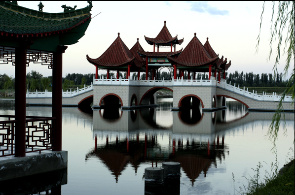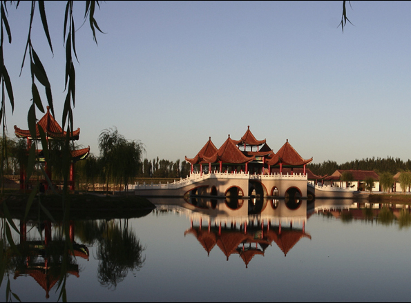 景區(qū)內(nèi)一邊是氣勢(shì)壯闊、一瀉千里的塔里木河,一邊是胡楊環(huán)抱的江南園林建筑。景區(qū)內(nèi)最為注目的是五亭橋,周圍亭臺(tái)樓閣、曲水環(huán)繞、軒榭廊橋、綠草如茵、啾啾鳥鳴、生機(jī)盎然。具有江南園林風(fēng)格的景區(qū),將亭臺(tái)樓閣組成的建筑群落與人文自然景觀相融合。