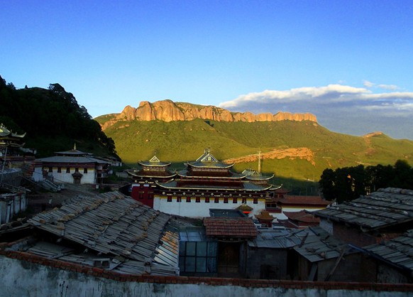 位于甘肅碌曲縣城南90公里處的郎木寺鄉(xiāng),西傾山支脈郭爾莽梁北麓的白龍江畔,地處甘、青、川三省邊界。郎木寺為藏傳佛教寺院?!袄赡尽睘椴卣Z(yǔ)“仙女”之意,因其山洞中有石巖酷似亭亭玉女,民間謂為仙女所化,故名。寺后林蔭深處有一虎穴,藏語(yǔ)稱“德合倉(cāng)”,故該寺之名可譯為“虎穴中的仙女”。郎木寺與四川境內(nèi)的格爾底寺隔白龍江相望,早年曾盛極一時(shí)。