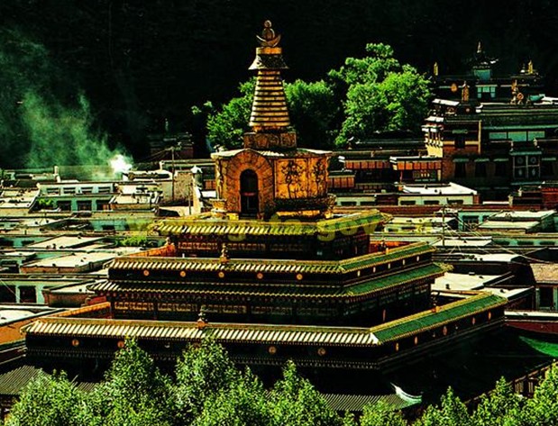 拉卜楞寺西南角,由三世貢唐倉•貢曲乎丹貝仲美大師建成于1805年,原名現(xiàn)見解脫大金塔,因塔內(nèi)供有從尼泊爾迎請來的無量光佛(阿彌陀佛)像而享譽海內(nèi)外,寶塔造型別致,工藝精巧,在建筑藝術(shù)與宗教意義上達到了完美神圣之境界。現(xiàn)存寶塔由六世貢唐倉•丹貝旺旭大師為丕振宗風(fēng),宏教利民,而于1991年2月8日在原寶塔遺址舉行凈地儀軌,主持籌建。工程竣工于1993年7月,于佛祖釋迦牟尼初轉(zhuǎn)法輪的殊勝節(jié)日舉行了開光永存儀式。貢唐寶塔高五層,31.33米,塔呈菩提式,版權(quán)所有山東聊城聊之旅國際旅行社有限公司,轉(zhuǎn)載必究!占地2144.16平方米,由塔剎、塔瓶和塔座組成。塔剎是日、月、星辰;塔瓶是精銅浮雕鎏金八大菩薩;塔座是琉璃瓦裝飾的三層四角形建筑。寶塔外形金碧輝煌,氣勢非凡,內(nèi)部構(gòu)造精巧,多寶嚴飾。塔內(nèi)正中是二層相互貫通的四座佛殿,供歷世貢唐倉靈塔或木雕鍍金像,并藏有兩萬余卷佛經(jīng)。殿頂供阿彌陀佛、二世嘉木樣和千佛銅像。貢唐寶塔與大夏河水、云杉禪林相映,矗然傲立,巍峨壯觀,現(xiàn)已對游人開放。