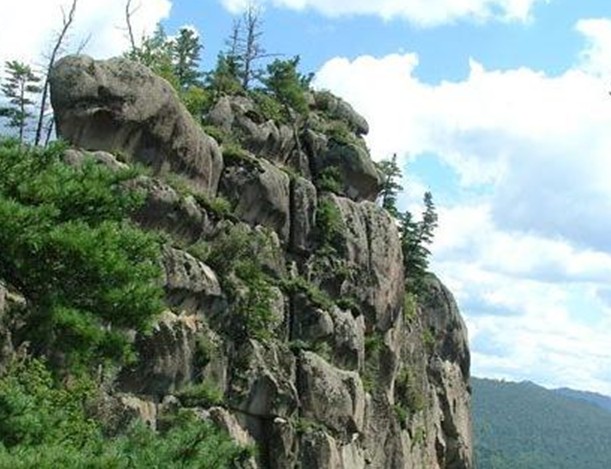 獅面山是一座面如獅頭的山,其鼻、嘴、眉清晰可辨,十分逼真,就好像獅子的面部一樣,它完全是大自然的神來之筆,未經(jīng)任何人的修磨,栩栩如生,別具風姿。從景區(qū)入口踏上365個臺階的云梯階,一步步登向一棵松。365個臺階意味著天天向上,一天一個新臺階的意思。第一個景點為一棵松,登上一棵松頂端,向南可看到小興安嶺最高峰——平頂山俯瞰鄉(xiāng)村面貌和蜿蜒流淌的小河,北望懸羊峰,西觀桃山奇峰,腳下松枝上碩果累累,巖石正中生長著的這棵百年紅松便是“一棵松”,在一棵松周圍還生長著興安杜鵑,山蔥、石花等。清晨登上一棵松,可觀日出林海,雨后登上一棵松,仿佛置身云霧中,此刻,霧從谷底升,云從天邊來,云霧就在您身邊,伸手可摸,這是思權(quán)亭。思松亭與一株百年紅松相偎依,微風拂過,松亭錚錚響,游客可坐在亭內(nèi)邊休息邊賞景。