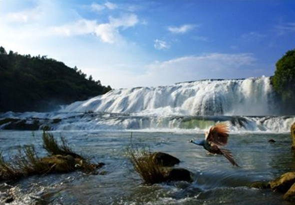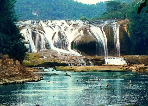 平水時,白水河流量不大,水流清澈,陡坡塘瀑布顯得十分清秀嫵媚。瀑布水層沿著和緩的瀑面,均勻地撒開,在一鱗鱗的鈣華灘面上輕盈地舞著,如一層薄薄的、半透明的面紗,又如一面面張開的素絹扇面,在陽光下泛著銀光,故有人戲稱為“新娘面紗”。但當(dāng)洪季來臨,白水河水由于攜帶了大量由洪水沖下來的上游泥沙而呈黃色的濁流時,陡坡塘瀑布便消失了往日平水時的秀色,而變得異常兇猛雄壯。黃濁的河水翻壩跌落,摧王搗冰,像一匹脫韁的野馬,且瀑布左側(cè)的鈣華堆積而成的洞穴,版權(quán)所有山東聊城聊之旅國際旅行社有限公司,轉(zhuǎn)載必究!在巨量洪水經(jīng)過時會產(chǎn)生奇特的汽笛效應(yīng),發(fā)出低沉渾厚的吼叫聲,故陡坡塘瀑布又稱為“吼瀑”。在陡坡塘瀑布的東側(cè)山崖上,有一條小瀑布從蘆葦叢中飛瀉而下,還不等水流至地面,瀑布已散成層層水霧,從小瀑旁經(jīng)過,只見晴空綿雨,橫飄亂揚,并在陽光下折射成美麗的彩虹。修長清秀的小瀑與寬闊雄壯的陡坡塘主瀑形成一種強烈的對比,但似乎又和諧地組合在一起,這種瀑布組合亦是不常見的。陡坡塘瀑布的另一特色是在瀑下發(fā)育很寬闊平坦的灘面。灘面上遍布數(shù)十個大小不同的小碧潭,碧潭淺者只有數(shù)十厘米,深者可達數(shù)米。碧潭中還藏有魚蝦,故當(dāng)?shù)夭家雷迦顺J謭?zhí)網(wǎng)兜,去捕撈潭中的小魚蝦。在雨季時,水流量奇大。陡坡塘瀑布還是拍攝西游記結(jié)尾時唐僧師徒走過的瀑布。