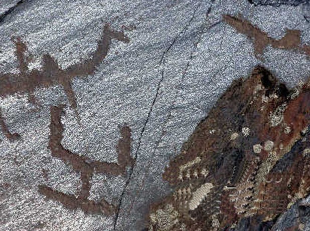 畫馬崖巖畫群中的巖畫,是用極其簡(jiǎn)單的線條勾勒出的各種造型,類似于現(xiàn)代繪畫中的速寫風(fēng)格,但是其線條卻異常簡(jiǎn)潔甚至抽象,寥寥數(shù)筆卻惟妙惟肖。以現(xiàn)代人的認(rèn)知對(duì)這些圖案進(jìn)行解讀,簡(jiǎn)單線條勾畫出的圖案可能是馬、人和太陽(yáng),還有一些魚、虎、龍、狗、仙鶴等等。然而,專家考察卻發(fā)現(xiàn),巖畫中描述人的線條頭型呈不規(guī)則的圓隆狀,四肢和身體都用形狀不同的線條表示。