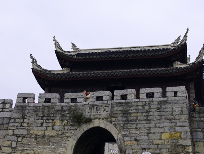 北城門(mén)又稱玄武門(mén),為重檐歇山式頂木結(jié)構(gòu)建筑屋頂為青灰色瓦面,泥塑脊飾,是古代欽差下達(dá)皇帝圣旨的場(chǎng)所。初建于明朝天啟年(1621-1624),清順治十七年(1601年)班麟貴之子斑應(yīng)壽子承父職(土司)將土城墻改建為石城墻,清嘉慶三年(1798),武舉人袁大鵬重修擴(kuò)建,是青巖軍事古鎮(zhèn)的象征之一。