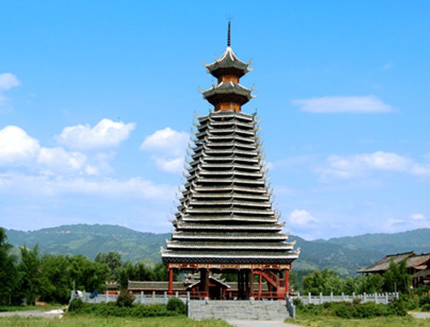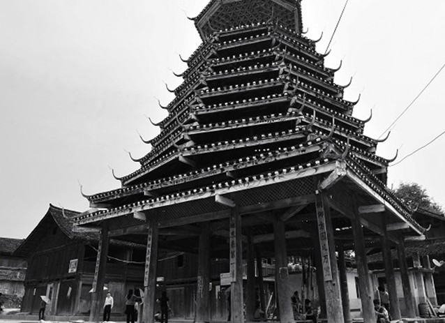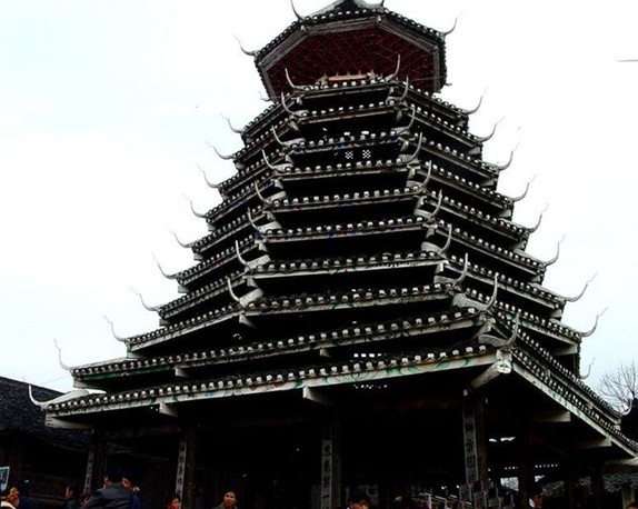 紀(jì)堂鼓樓位于貴州省黎平縣肇興鄉(xiāng)紀(jì)堂寨上,共3座。十分雄偉壯觀,1982年,紀(jì)堂鼓樓被列為省級重點文物保護(hù)單位。紀(jì)堂分上寨下寨,各有一座鼓樓,由十二根大杉樹原木支撐而起。塔身分八角,而頂層卻變化為四角攢尖頂花重檐。鼓樓周圍的地面和民居的走道上都以卵石鑲嵌成象征喜慶吉祥的圖案。紀(jì)堂鼓樓建筑年代久遠(yuǎn),曾多次修葺。1966年遭到破壞,1978年當(dāng)?shù)囟弊迦嗣褡栽斧I(xiàn)工獻(xiàn)料重新修復(fù)。塘明鼓樓由12根大杉木立于柱礎(chǔ)之上,高約22米,突兀寨中。該樓以逐層內(nèi)收的梁枋和全爪柱支撐層層挑出層檐,形如寶塔,內(nèi)無層板,空至寶頂。鼓樓基面約160平方米,中央用青石板鑲成一個火塘,周圍有簡易木凳。樓前有一歌坪,坪邊建有一個小巧玲瓏的侗戲臺,與鼓樓相對。該樓底層呈方形,上為八角形,共有9重檐,為四角攢尖頂。版權(quán)所有山東聊城聊之旅國際旅行社有限公司,轉(zhuǎn)載必究!鐵制寶頂下有如意斗裝飾。檐面鋪小青瓦。屋脊白色,翼角高翹而起,裝有套獸,塑有獅、虎、鳳、猴、兔、蛇、蟲、鳥等動物雕塑裝飾。樓內(nèi)亦雕梁畫棟。樓上一二層檐之間有“二龍戲珠”木雕,大門上有“幸福堂”金字匾額,耀眼奪目。