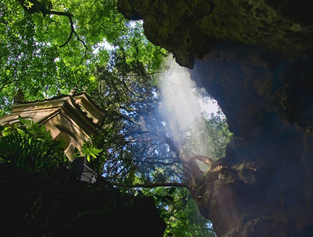原廟傳為苗民草創(chuàng),每年農歷“四月八”,數(shù)萬苗胞聚集于此,跳笙、對歌、賽馬、斗雀,狂歡三晝夜。明王守仁勝贊之曰:“天下山水之奇聚于黔中,黔中山水之奇聚于此崖?!憋w云崖似洞非洞,內甚寬敞。頂上崖檐覆出,石乳倒垂。浮者若飛霞,亙者若虹霓,豁然樓殿門闕,懸若銅鼓編磐,并有獅象蛟龍、蓮行阡陌、蜂房水渦之屬。其下澄潭邃谷,幽深無底。巖半立大士像。