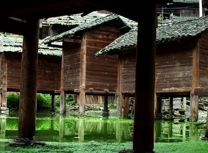 新橋苗寨是性感超短裙苗之鄉(xiāng)。新橋的苗族女人通常穿一種僅長(zhǎng)5-7寸的百褶裙,被人戲稱為“超短裙”。具體的穿法是,平時(shí)穿兩條裙子,節(jié)日盛裝的時(shí)候穿三四條裙子,但不管穿多少裙子,長(zhǎng)度總也不會(huì)增加;裙子里面穿窄腿長(zhǎng)褲或打綁腿,裙子外面罩有花圍腰和花彩帶;上身多是繡花衣、對(duì)襟衣,衣服上的刺繡花樣多為蝴蝶花紋。她們的“唐朝發(fā)式”也很有意思。將頭發(fā)梳成大髻,再用大木梳固定聳于頭頂,和唐代壁畫上的仕女非常相似。一走進(jìn)寨子最先注意到的便是這里的“水上糧倉(cāng)”。為了防火、防老鼠和防螞蟻,保護(hù)糧食,新橋把糧倉(cāng)都建在寨中的水塘上,一家一戶一座糧倉(cāng)。